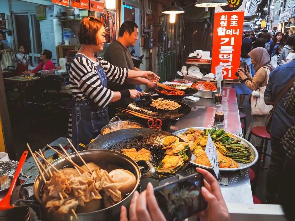 Nếu bạn là người đam mê ẩm thực đường phố thì chớ có bỏ qua món bánh gạo cay Tteokbokki. Đây là loại bánh cuộn nhỏ, cũng gần giống với bánh dày của Việt Nam. Tuy nhiên, Tteokbokki được ăn kèm với nước sốt cay. Bên cạnh Tteokbokki thì Gimbap cũng được chọn là một trong những món ăn đường phố quen thuộc. Gimbap được làm chủ yếu bằng cơm, bên ngoài cuộn lá rong biển khô. Đồng thời, Twigim cũng góp mặt tạo nên ẩm thực ẩm thực đường phố phong phú, hấp dẫn của Hàn Quốc.