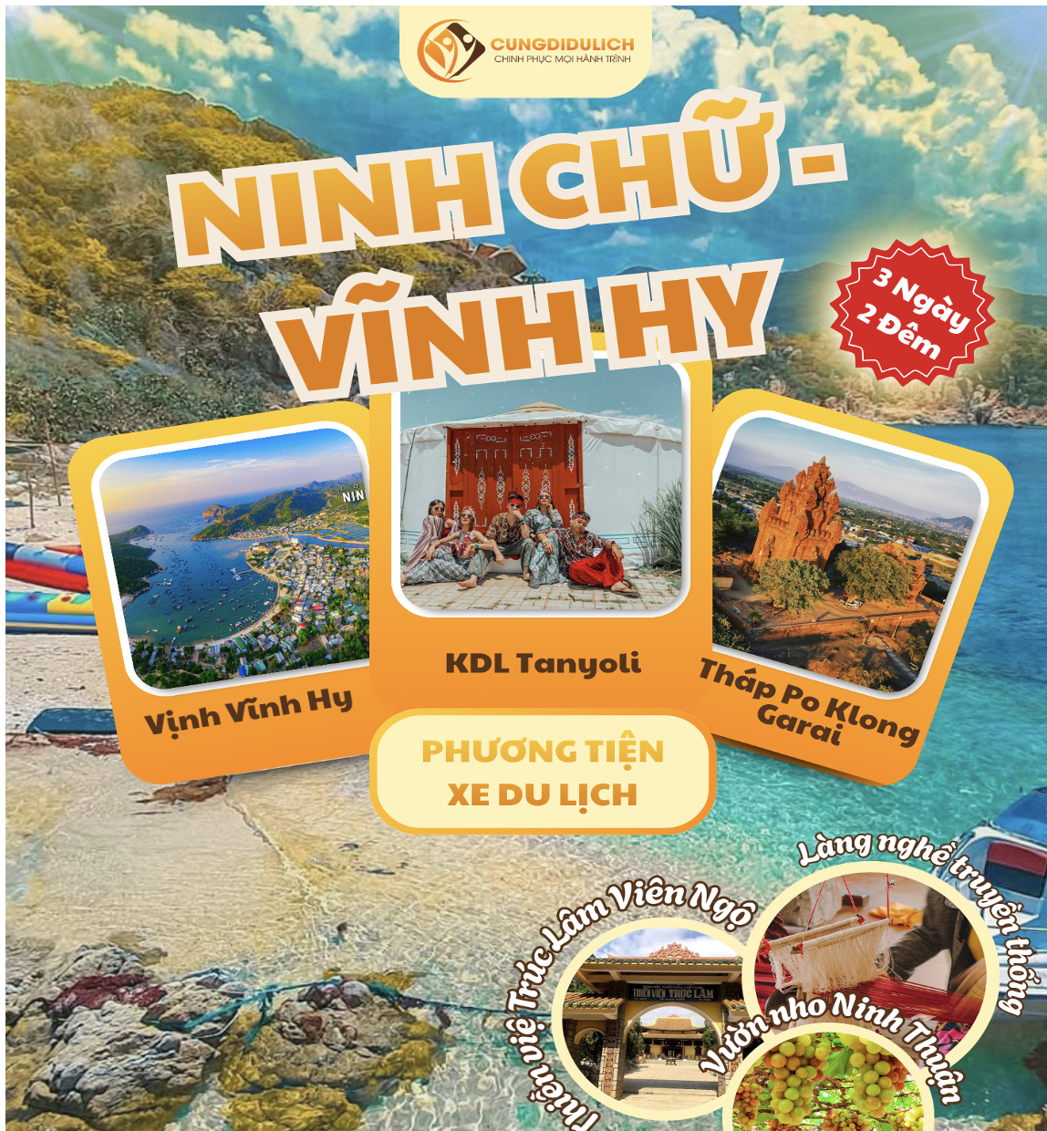 Cùng Đi Du Lịch giới thiệu chương trình du lịch Ninh Chữ – Vĩnh Hy – Tanyoli 3 ngày 2 đêm khởi hành thứ 6 hàng tuần.