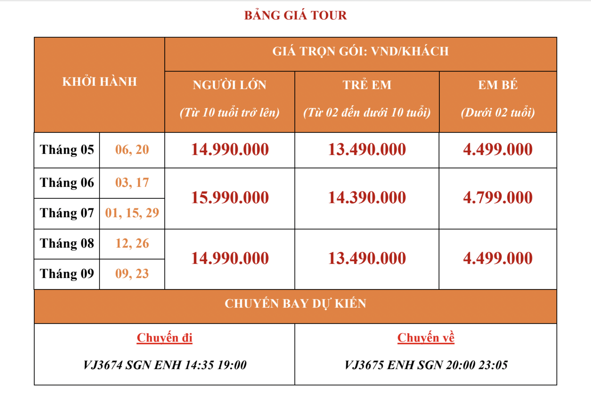 - Em bé: Từ 0 đến dưới 02 tuổi (ngủ chung giường với bố, mẹ): 30% giá tour.