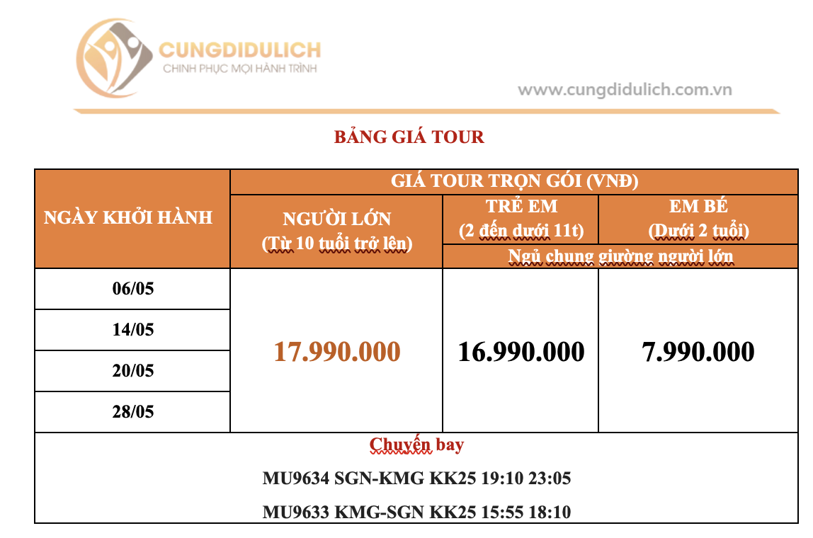 - Vé máy bay khứ hồi Sài Gòn <=> Côn Minh (bao gồm 7kg hành lý xách tay. + 23 kg hành lý ký gửi)