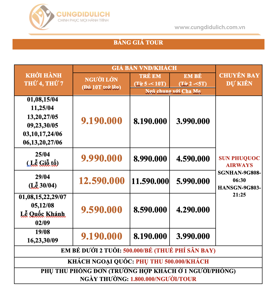 Dưới 02 tuổi: Miễn phí (chi phí phát sinh trên tour gia đình tự chi trả) + phụ thu vé máy bay theo quy định hãng. Hai người lớn chỉ được kèm theo 01 trẻ, từ trẻ thứ hai tính 50% giá tour.