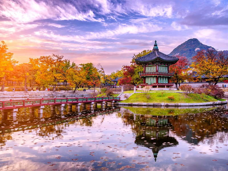 Cung điện Gyeongbokgung – Biểu tượng lịch sử của Seoul, gây ấn tượng bởi không gian rộng lớn, kiến trúc hoàng gia tinh xảo và nghi thức đổi gác đậm nét văn hóa truyền thống.