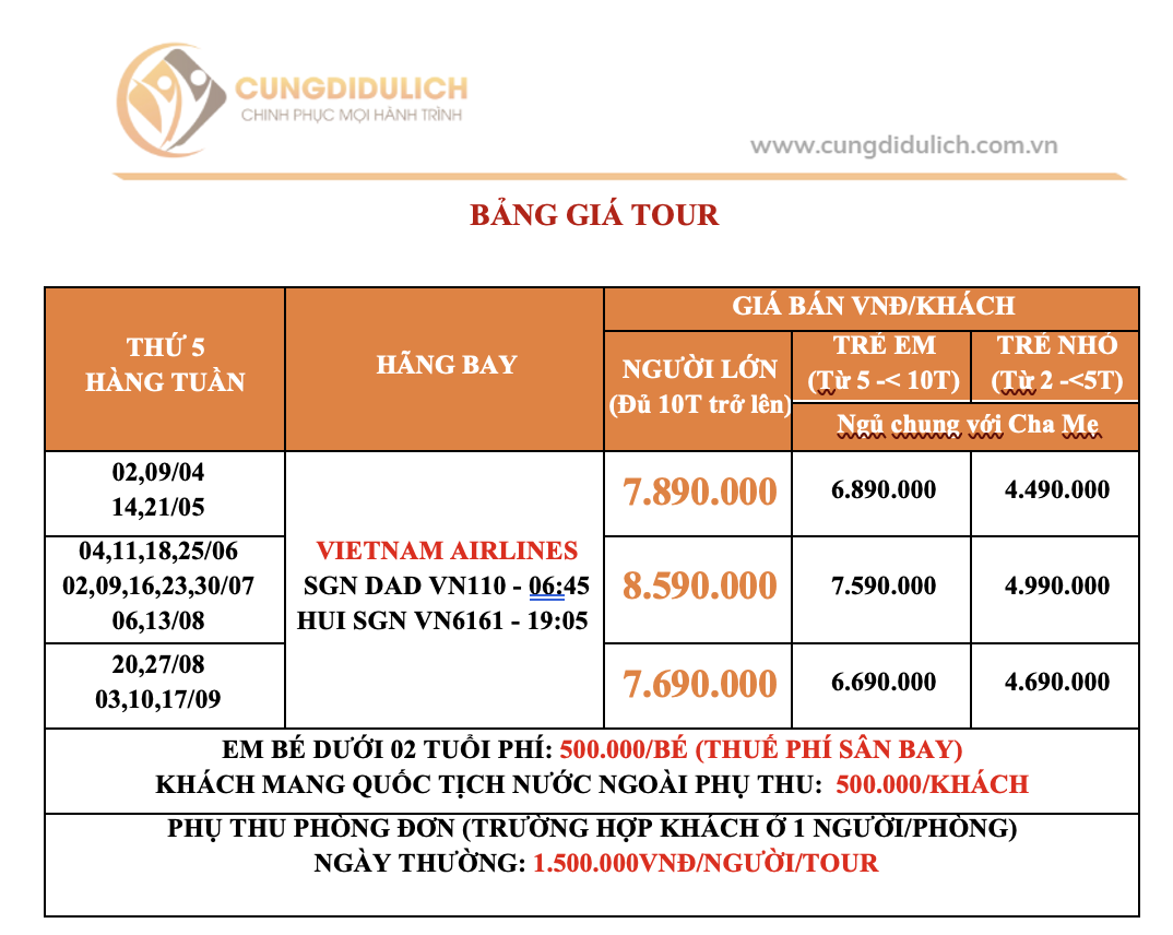 Dưới 02 tuổi: Miễn phí (chi phí phát sinh trên tour gia đình tự chi trả) + phụ thu vé máy bay theo quy định hãng. Hai người lớn chỉ được kèm theo 01 trẻ, từ trẻ thứ hai tính 50% giá tour.