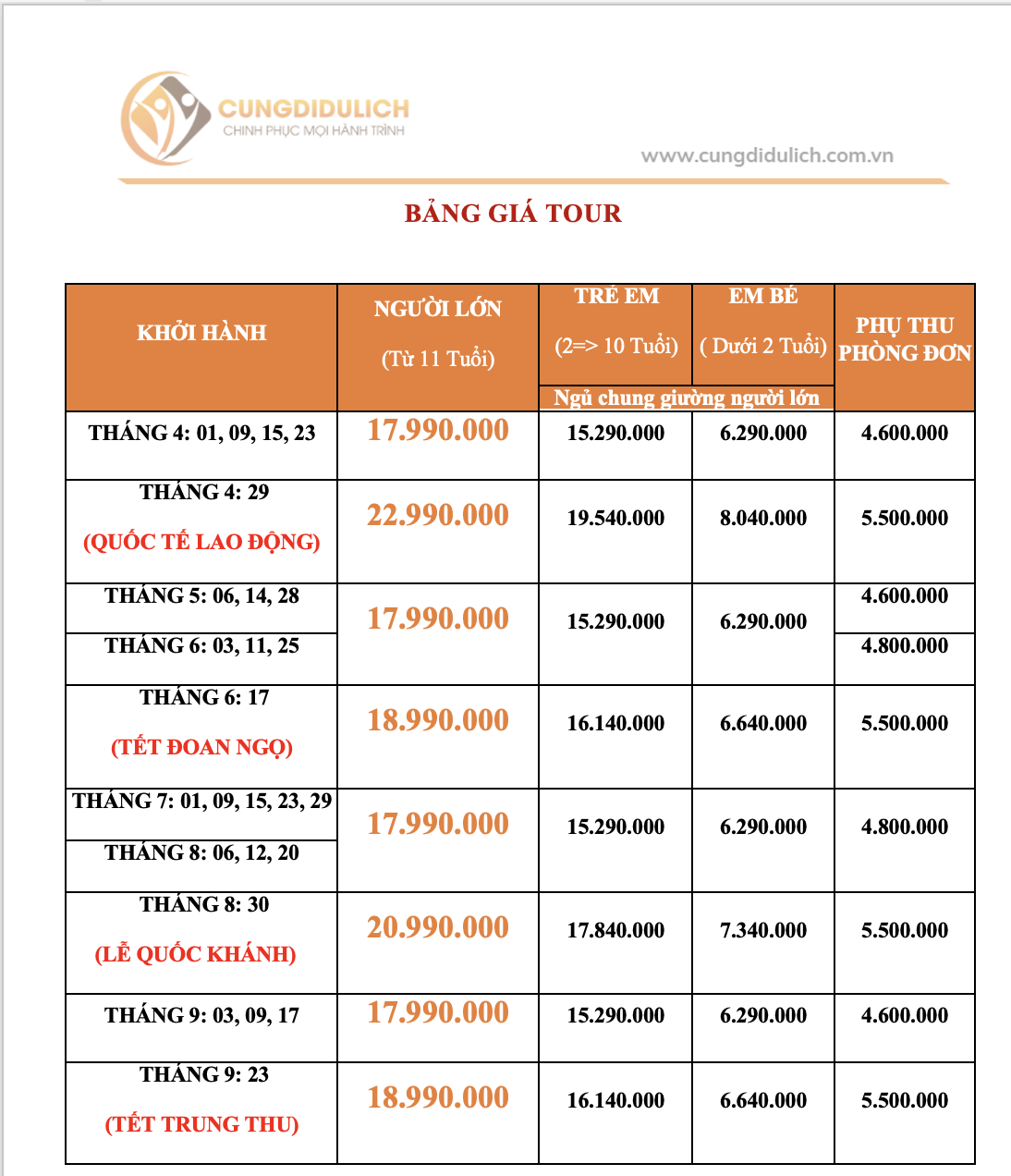 Trẻ em từ 11 tuổi trở lên: 100% giá tour người lớn.