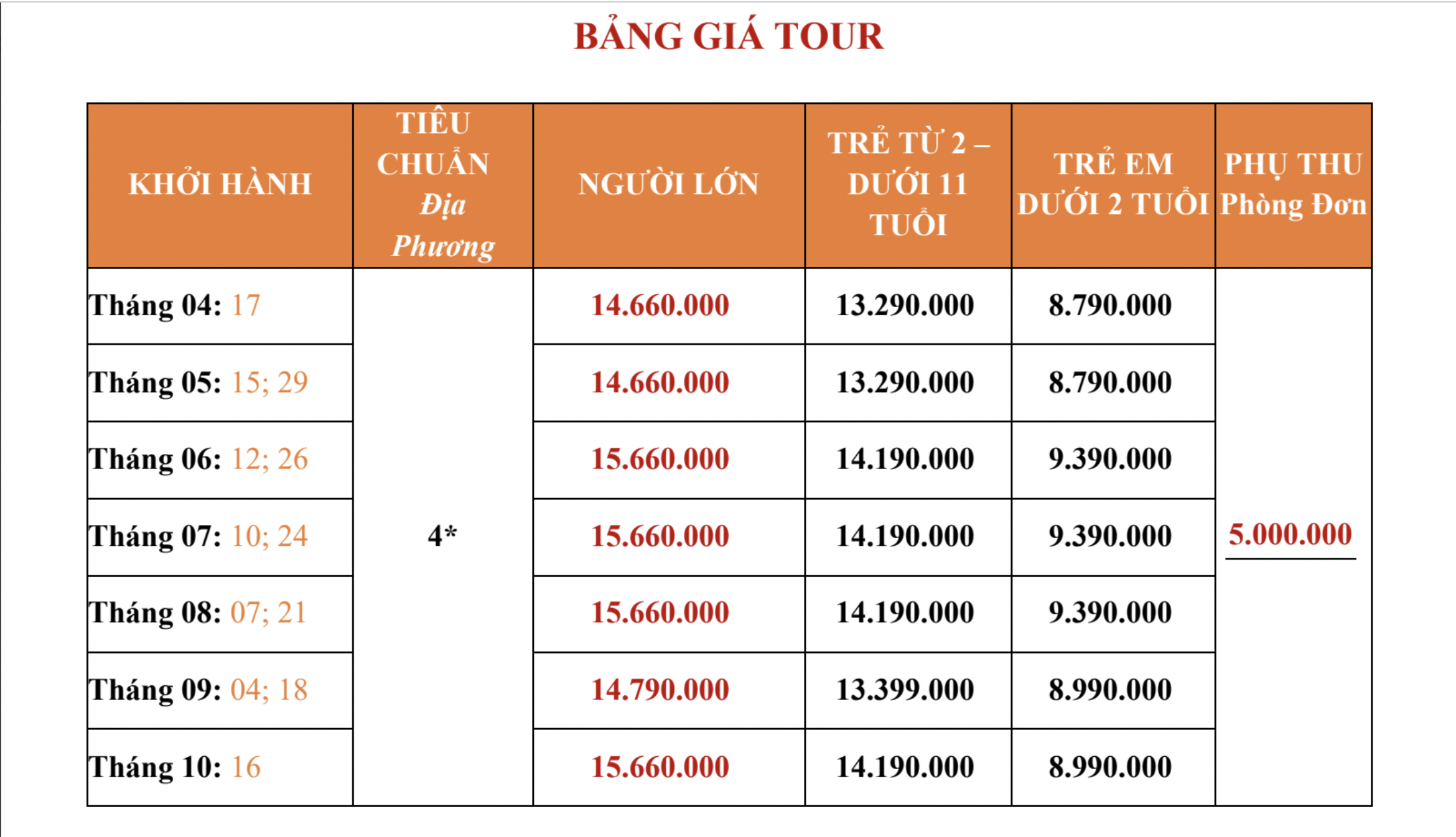 - Chi phí nghỉ phòng đơn 5.000.000vnđ/khách/tour