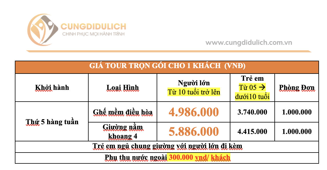 Từ 10 tuổi trở lên: giá tour như người lớn.