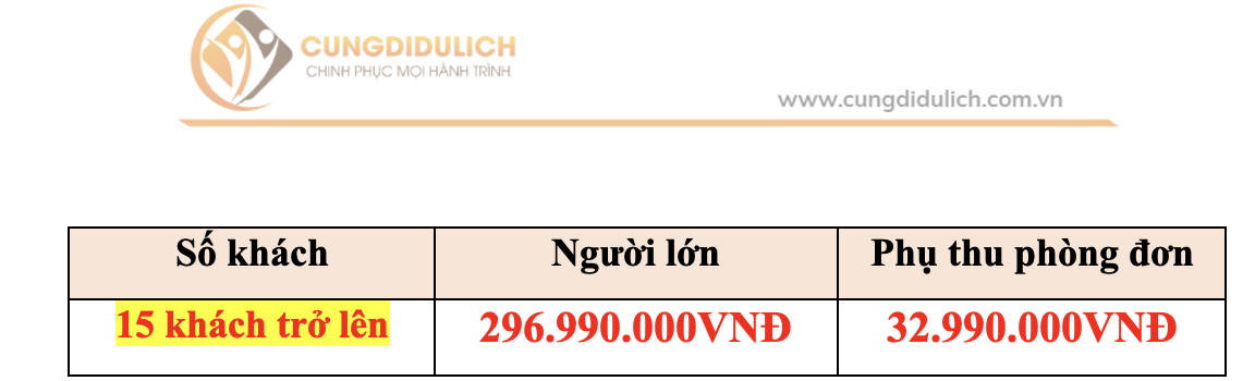 - Giá Công ty đưa ra là giá trung bình áp dụng cho 01 khách cho đoàn ghép lẻ từ 15 khách, trong trường hợp số lượng khách không đủ để khởi hành, Công ty sẽ báo trước cho Quý khách trước tối thiểu 03 ngày tính từ ngày khởi hành và chuyển khách sang ngày khác gần nhất mà không phải bồi hoàn thêm bất cứ chi phí nào. (Không tính Lễ, Tết)