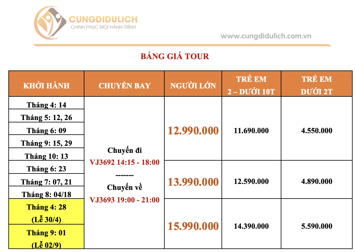 - Em bé: Từ 0 đến dưới 02 tuổi (ngủ chung giường với bố, mẹ): 30% giá tour.