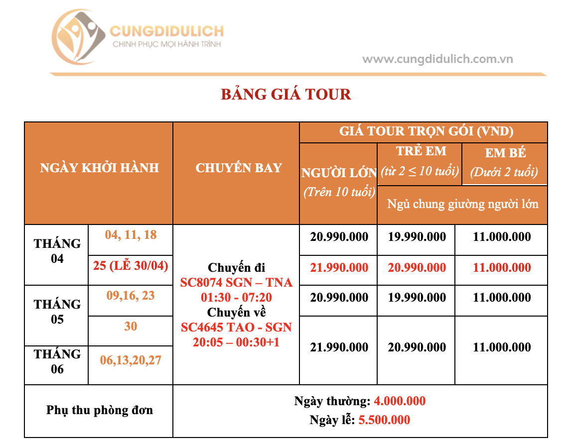 - Giá Công ty đưa ra là giá trung bình áp dụng cho 01 khách cho đoàn ghép lẻ từ 20 khách, trong trường hợp số lượng khách không đủ để khởi hành, Công ty sẽ báo trước cho Quý khách trước tối thiểu 03 ngày tính từ ngày khởi hành và chuyển khách sang ngày khác gần nhất mà không phải bồi hoàn thêm bất cứ chi phí nào. (Không tính Lễ, Tết)