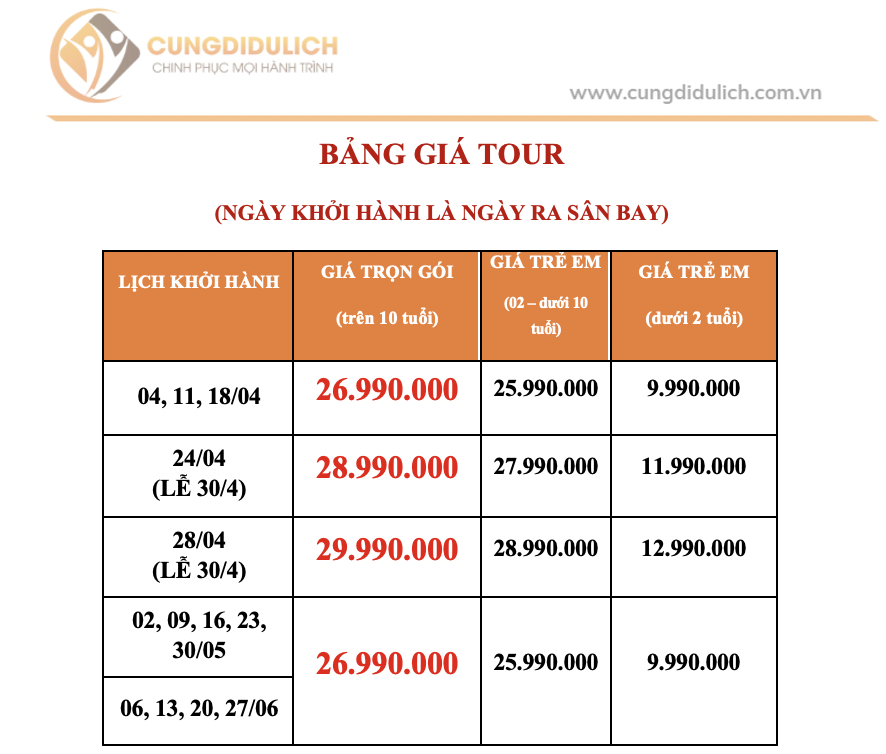 - Em bé: Từ 0 đến dưới 02 tuổi (ngủ chung giường với bố, mẹ): 30% giá tour.